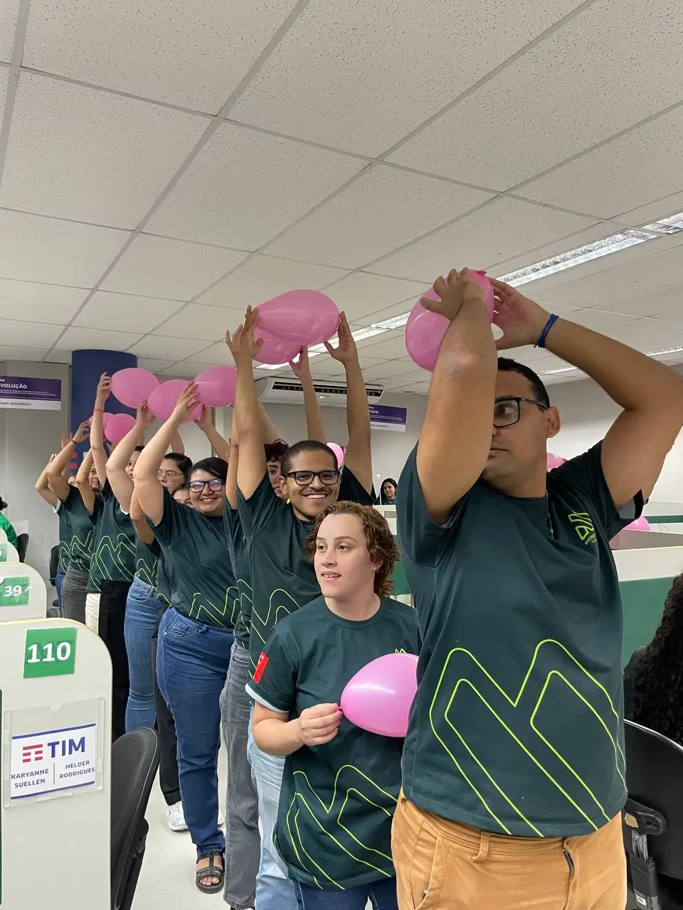 Em celebração ao Outubro Rosa, a atividade se transformou em uma aula lúdica, utilizando balões rosas para os exercícios. Mais do que um acessório, os balões serviram como uma poderosa metáfora: a leveza necessária para combater a “carga mental” e a cor rosa para lembrar a todas, de forma visual e alegre, da importância da prevenção. Foi uma pausa ativa que quebrou a rotina, aliviou tensões musculares e espalhou a mensagem da campanha de forma inesquecível.
